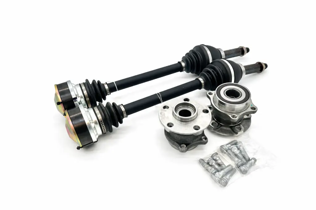 These axles are designed to be used with the included billet wheel hubs and ARP extended wheel studs. These upgraded billet hubs have a larger spline size that will hold up better to hard launches and abuse. The Pro-Level Axle/Hub kit feature extra large 30 spline aerospace grade torsional axle bars, a direct-fit inner CV, and 108mm Porsche-style outer CV. The outer hub is machined to accept the OEM ABS rings (you will reuse your OEM rings). Designed for pro drag race use but is suitable for any streetcar.